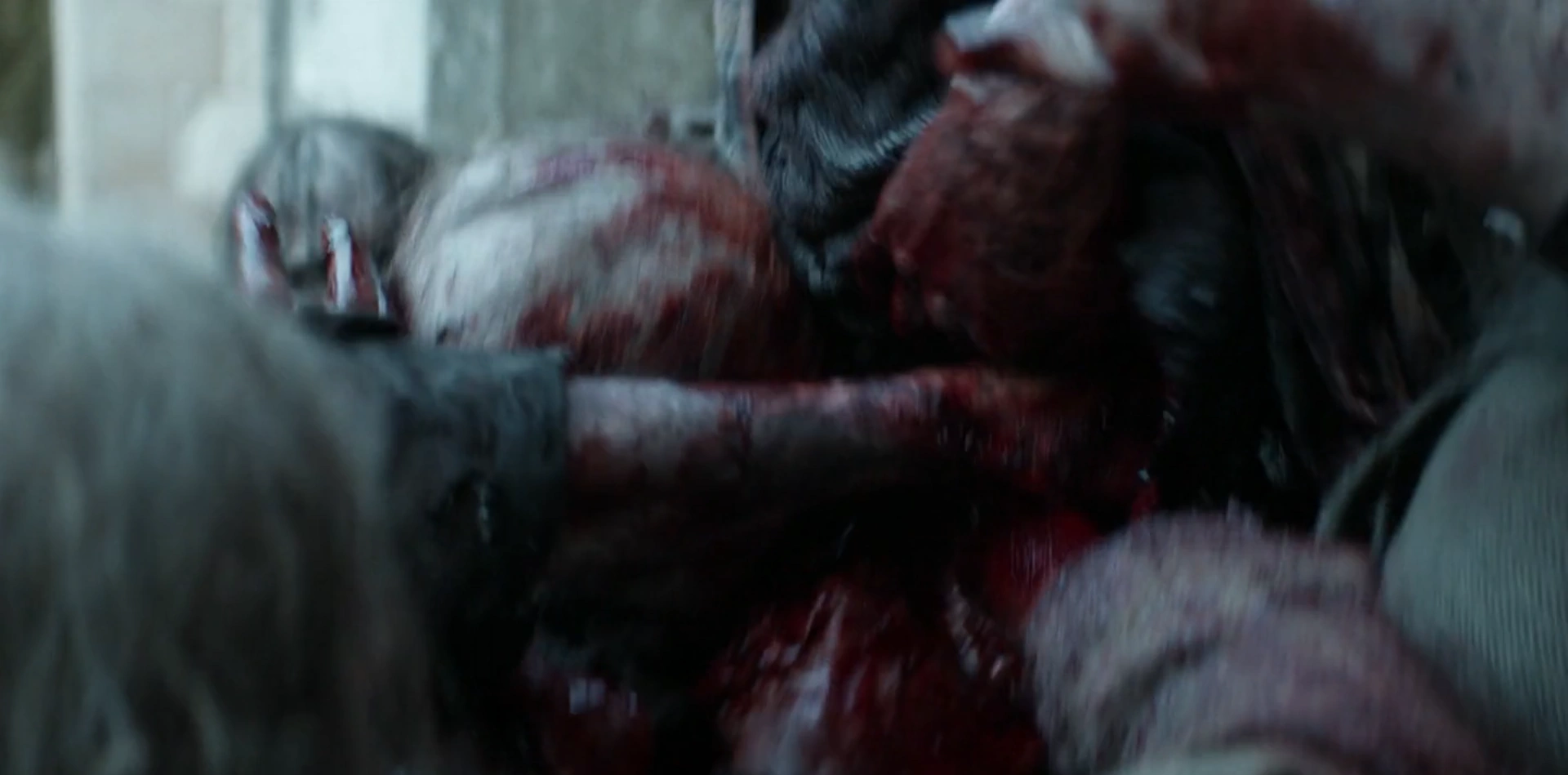 Daryl immediately draws his knife and morning star to fight the walkers, but R.J. is left dangling helplessly within the herd's reach from the rope that he's still attached to. The walkers devour R.J. while Daryl retrieves his rifle and shoots the fuel canisters, causing a large explosion that blows up a large number of the walkers, including the walkers gathering behind Daryl, while Daryl is protected by crouching behind the corner of the wall.