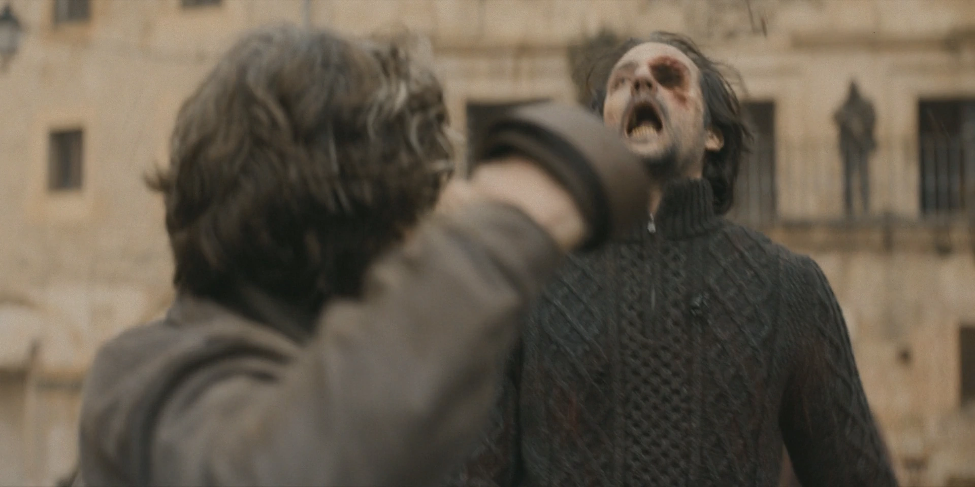 As the zombified Rodolfo attacks his friends, Daryl shoots him in the eye.