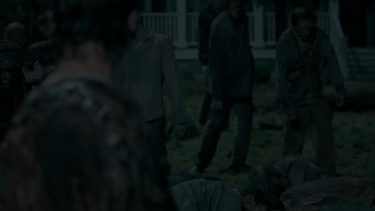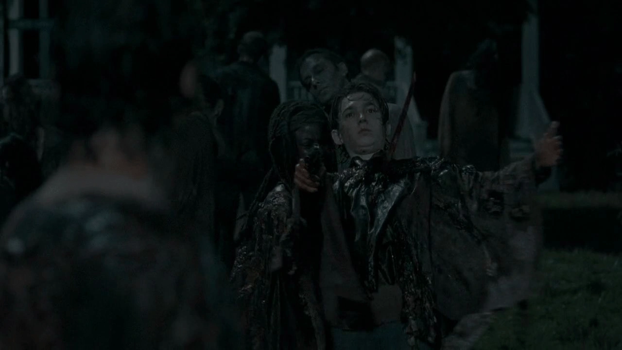 He is later seen trying to hold the makeshift defenses they made around the house, just as the herd begins to break in through the front door and windows. He and the others retreat upstairs, where Rick and Michonne kill and carry two walkers and decide to use their blood and organs to mask their scent to blend in with the herd below to escape.
