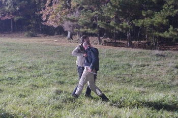 Shane gets Hershel's permission to do some gun practice with the group and some members of the Greene Family. Carl approaches Shane and asks him to teach him how to shoot too. At first Lori is opposed but Rick convinces her to let Shane teach Carl. At the training, most of the group does fairly well, and Andrea seems to excel. Shane gives her some private tutoring after the rest of the group head back to the farmhouse. Shane is an expert instructor, but while trying to distract Andrea as part of the lesson, he mentions Amy's death and upsets her. They make up as part of an agreement that Shane is to take Andrea with him on a mission to investigate a lead on Sophia, she accepts and they go on to search some houses in a small neighborhood called Wiltshire Estates.