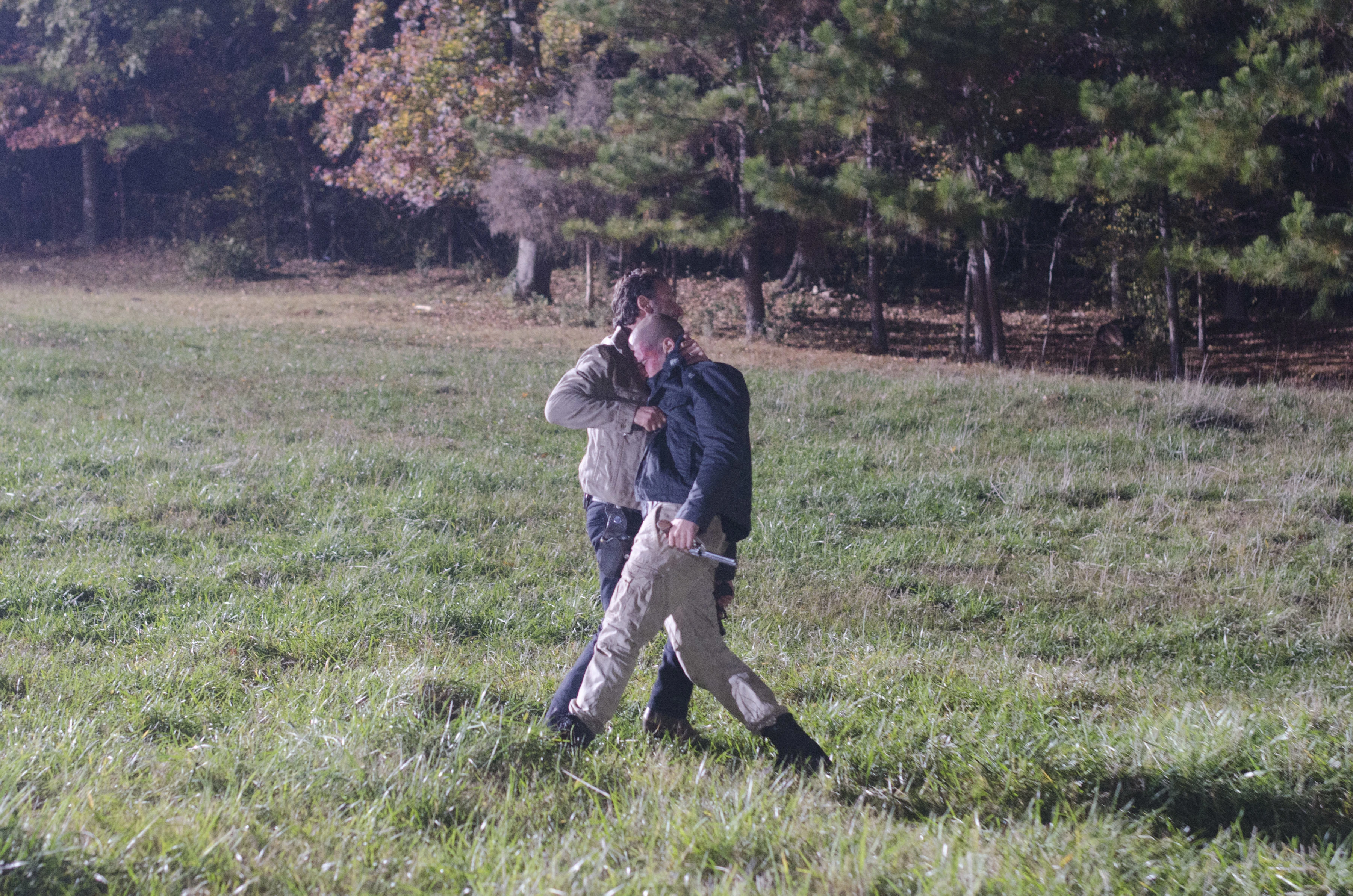 As Rick realizes that Shane has lured him into the middle of a field in the forest with the intention of killing him, Shane aims his gun at him. Rick makes it seem as though he's handing Shane his weapon, as he refuses to be armed, telling him that they can forget everything and move on.