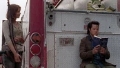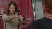 "Crossed" | Maggie Green points her M&P R8 at Abraham to keep him in line. |