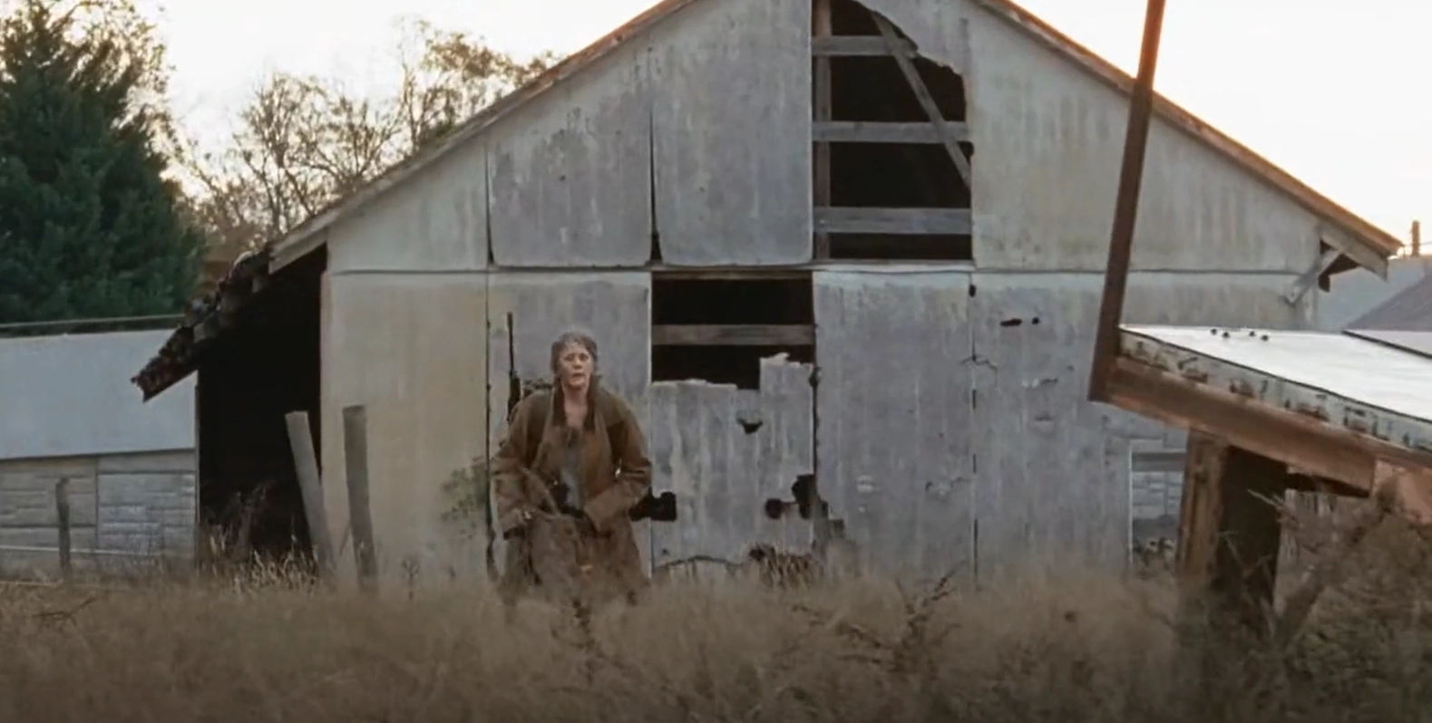 the injured Savior finally catches up with Carol and shoots her in the arm. He says he plans to watch her die, slowly, as his friends did, and as he likely will. Carol smiles, admitting that she is happy to die. The Savior shoots her in the leg. Before he can finish her off, Morgan arrives and orders him to stop. When the Savior refuses, Morgan shoots him multiple times in the chest, throat, and finally in the head, killing him. Carol begs Morgan to let her go, but he refuses. "You're going to come back from this," he says. Two men wearing armor approach on horseback: one of them is the man from the barn. Morgan shakes his hand, and he agrees to get Carol medical assistance.