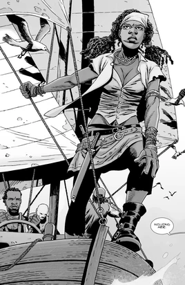 Three weeks after being discovered by Pete, Michonne wakes up on the vessel to find him adjusting the radio dials on the vessel, attempting to contact trading partners Rashid and Vanessa. He fails to contact them however picks up an unknown survivor on the shortwave. Michonne manages to speak to the survivor and gain a little information about their situation. Shortly after, the ship becomes grounded on part of a submerged shipwreck resulting in some damage to the ship. Michonne and Pete decide to take the dinghy and search a nearby shipwreck for parts in order to get the ship free and fixed. However, they are captured and taken to the floating survivors colony of Monroe, who appear very hostile to any survivors near their location; which may include the crew of the Companion.