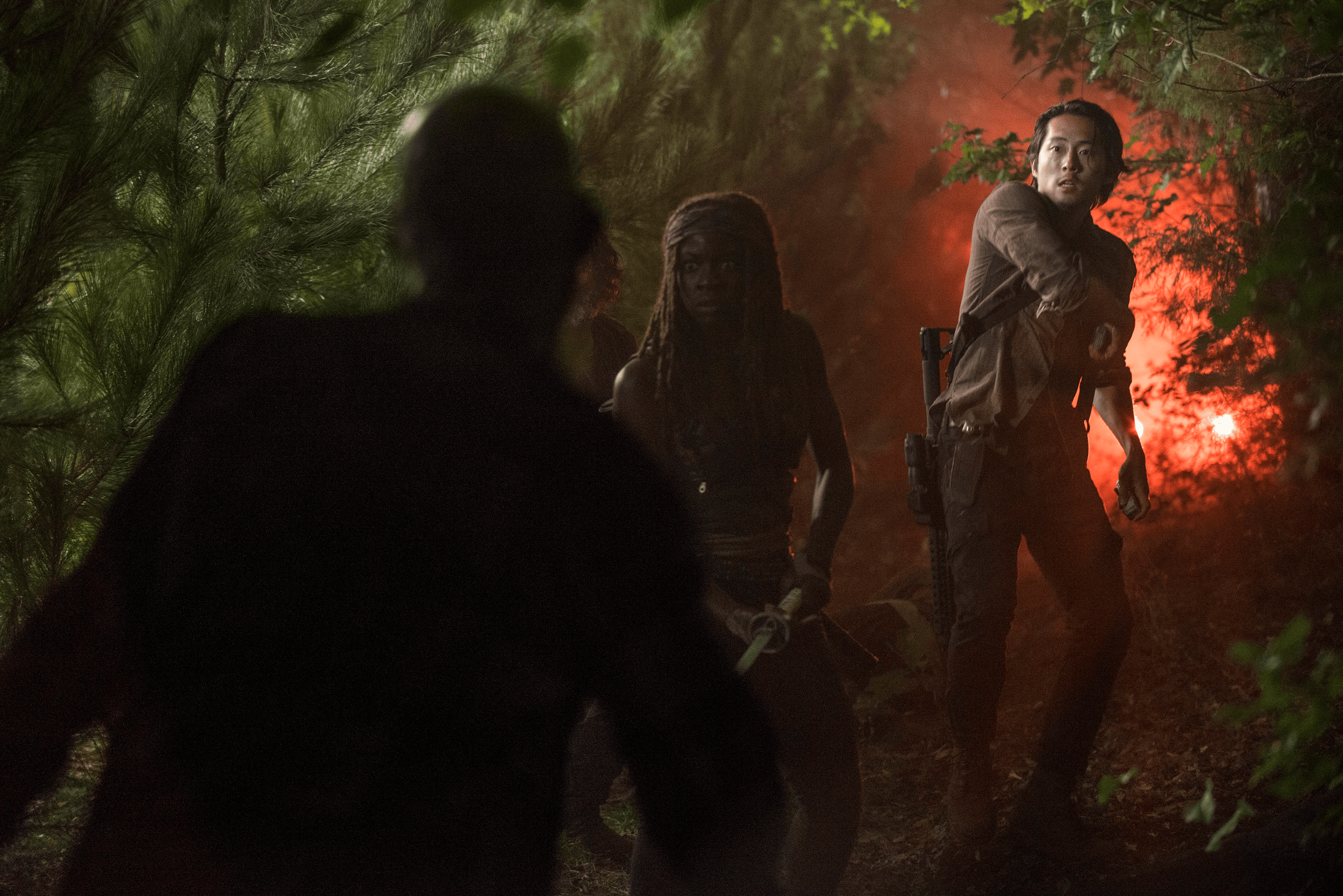 The conversation is interrupted when Rick finds the radio which Aaron used to eavesdrop on the conversations held amongst the group, right before the car runs in the dark through a herd of walkers, the blood of the walkers turning the car and the lights red. The car continues to ram through the herd, before the group stops and exits to check if the others are still behind them. Glenn reports that they have made it out. Rick rushes back in and Glenn tries to restart the car, failing due to the overwhelming amount of gore caught in the engine. The group stops for a moment when a lit flare is seen from afar. Aaron starts to panic, concerned it might be one of his own. He frantically requests for his freedom, but after the group continues to press him for answers, he becomes violent, kicking the door open and knocking Michonne over. As he runs away, Rick assures that they do not have to chase after him. Michonne suggests that the rest of the group may have also seen the flare and thought it was Rick, and believes it will be an easier way to find them. Rick and Glenn follow Michonne into the woods, finding themselves trapped with walkers surrounding them. Glenn eventually becomes separated, causing panic amongst the remaining two members, who are forced to hold off the approaching walkers themselves. While Glenn tries to find a way back to the others, he finds Aaron cornered by a walker and unable to defend himself due to his bounds. Initially deciding to leave him, Glenn changes his mind, assisting him and cutting him loose.