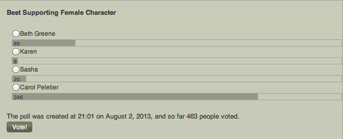 There were fifteen categories in these awards, with four nominees in each category. The awards ran from August 2nd, 2013 to August 13th, 2013. Over 6,796 votes were cast in total.