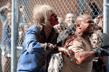 While wandering through the prison, T-Dog and Carol run into two walkers. Knowing his time is up, he uses his last moments to save Carol's life. He charges himself at the walkers, holding both of them back, giving Carol time to escape, before a chunk of his throat is ripped out and he is devoured.