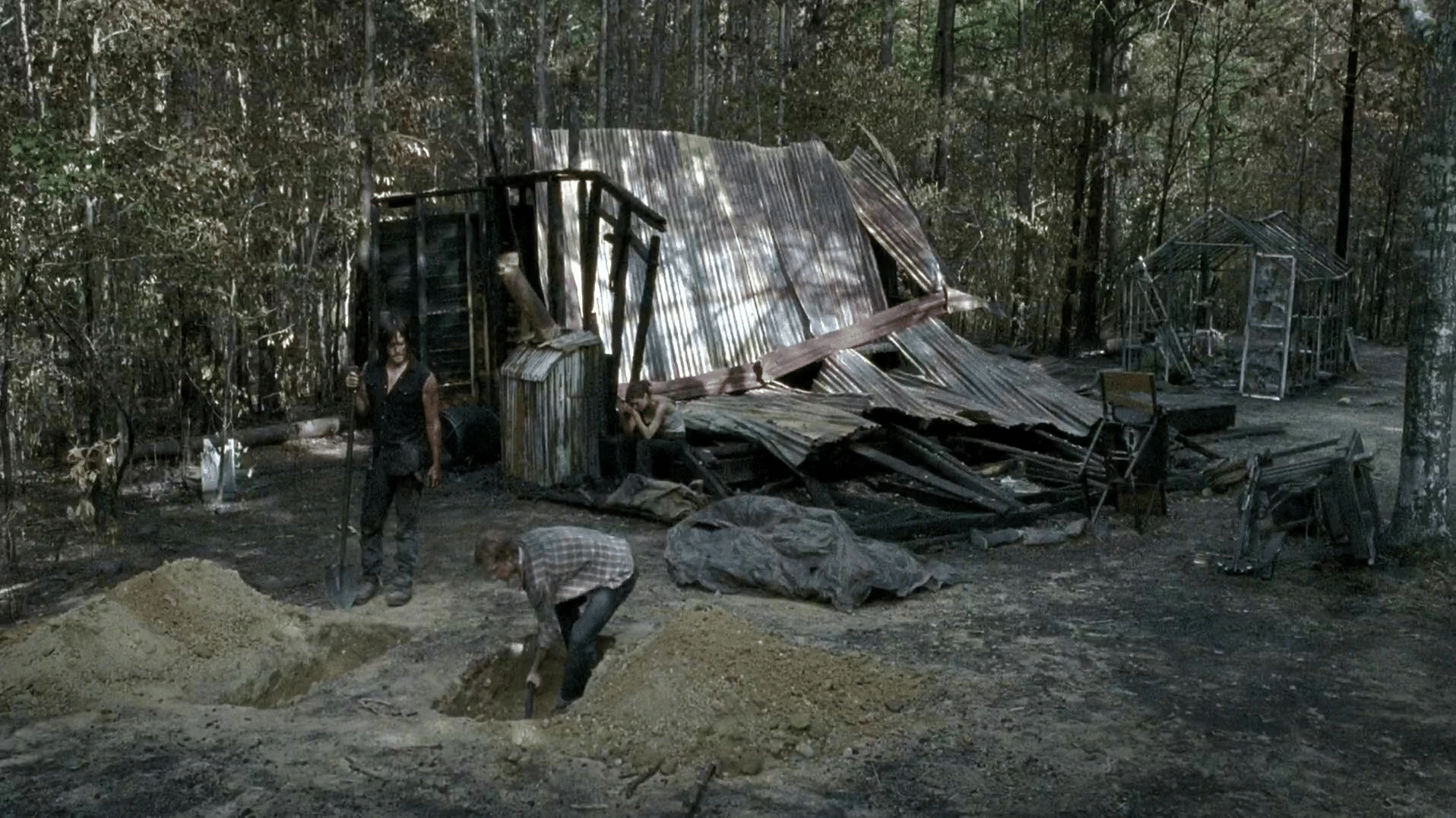 While hiding in a burnt forest, the trio encounters a stranger named Daryl Dixon and takes him hostage due to thinking he is part of the Saviors. They force him to go along with them as they search for their escape truck, nicknamed "Patty". Unfortunately, they find the compound overrun with walkers, and when Tina faints, requiring another dosage of insulin, Daryl uses this as an opportunity to take their supplies and flee. A while later, Daryl reluctantly returns their medicine, but not before forcing them to shed their other possessions. Suddenly, Wade and his men arrive in the forest looking for them. As they hide, Daryl makes a distraction, and Tina witnesses Cam get his arm bitten by a walker.