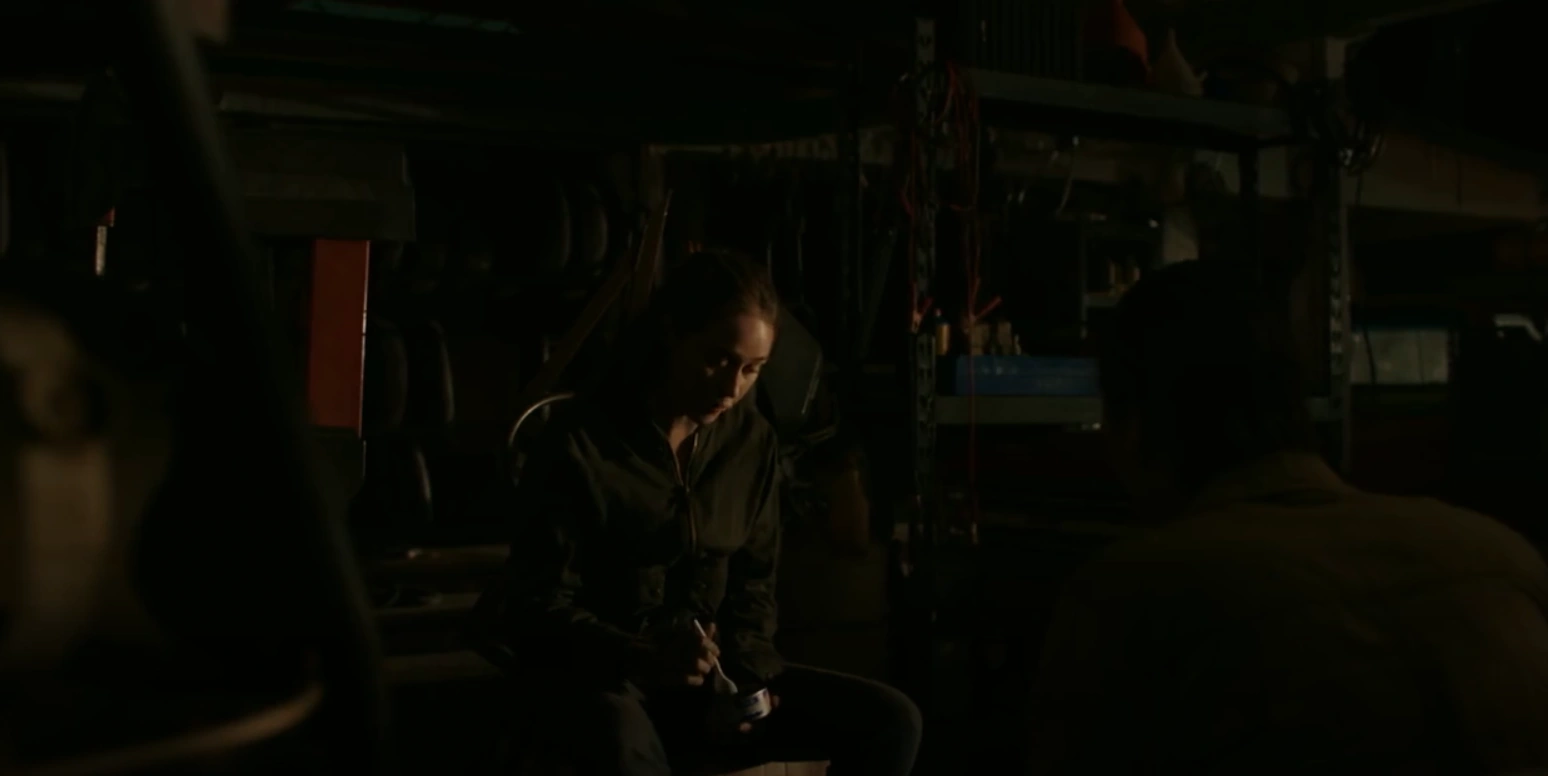 Alicia eats dinner inside this workshop. She hears a car and readies her rifle. It's Nick and Troy.